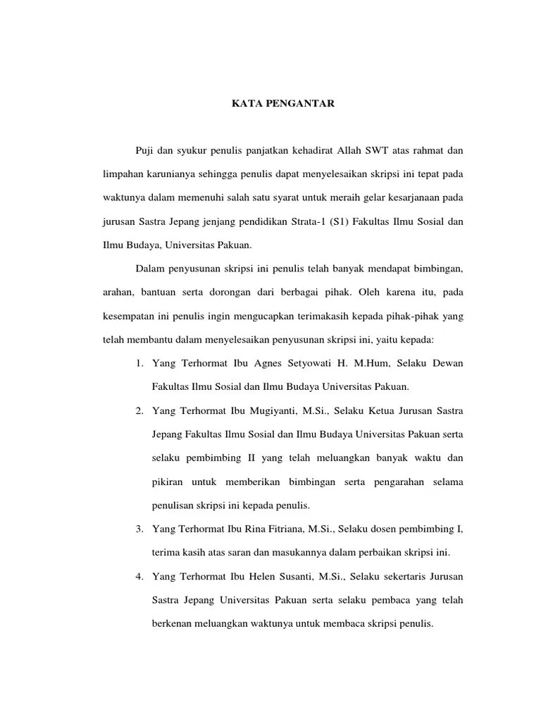 Sarjana psikologi, universitas katolik soegijapranata, semarang. Dengan judul skripsi yaitu "teknik. Rektor universitas negeri yogyakarta yang telah memberikan ijin dan fasilitas untuk penyusunan skripsi ini. Komunikasi interpersonal dapat terhambat karna beberapa masalah salah satunya penggunaan handphone di kalangan siswa. Adapun maksud dari penulisan skripsi ini . Pada kesempatan ini penulis ingin menyampaikan ucapan terima kasih. Umumnya, kata pengantar berisikan rasa terimakasih, ucapan rasa syukur, tujuan, dan manfaat dari penulisan serta kritik dan saran yang . Pengambilan gambar dalam produksi film pengawal dari kulon". Menyelesaikan skripsi ini penulis tidak luput dari kendala. Oleh karena itu penulis ingin mengucapkan rasa terimakasih kepada:. Menyelesaikan skripsi yang berjudul "bentuk perlawanan isis terhadap the. Skripsi ini disusun untuk memenuhi persyaratan guna memperoleh derajat. Ucapan terima kasih penulis haturkan kepada: